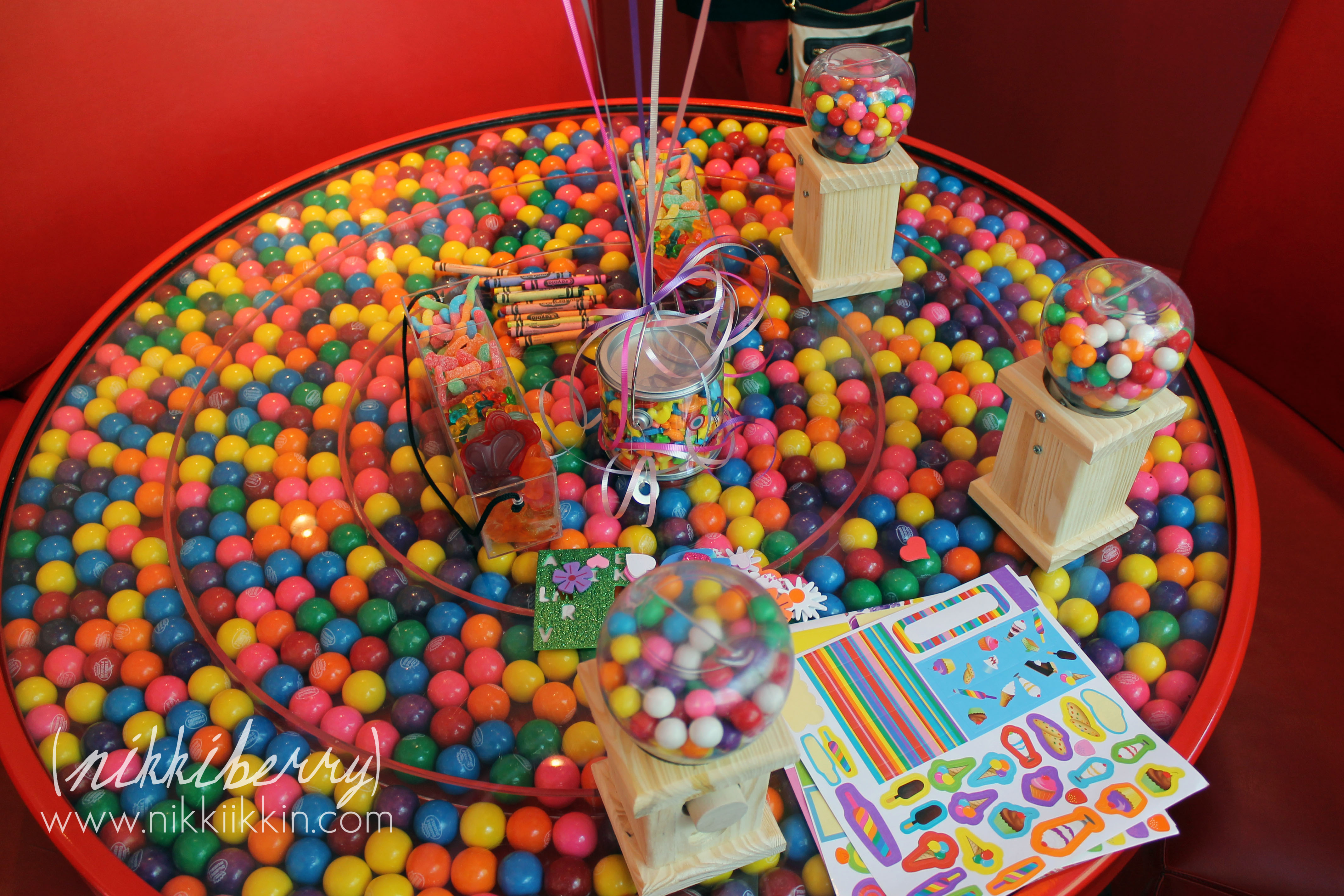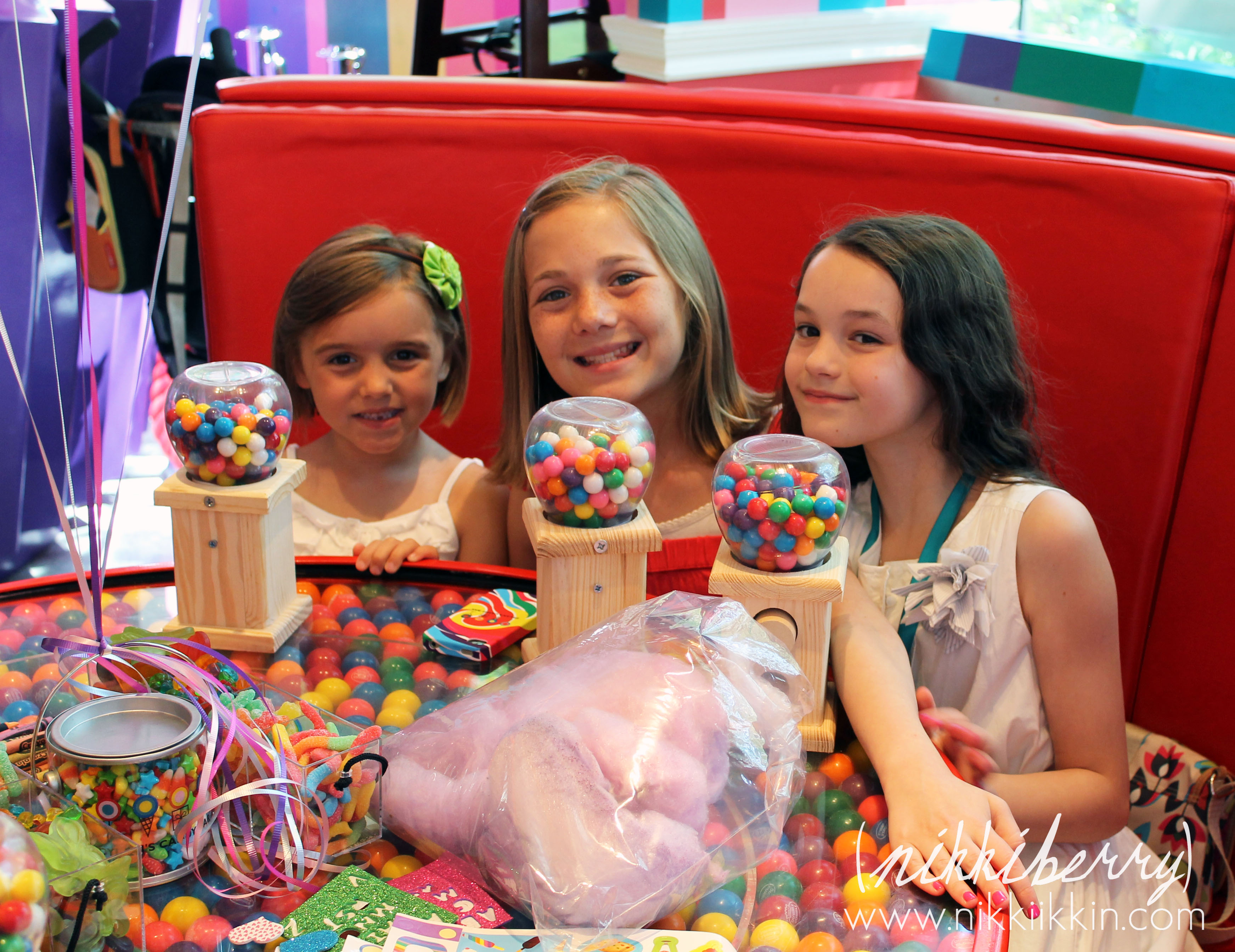 First up on the party schedule was the craft, out of a list of candy related crafts Macy choose the gumball machine decorating. The girls took home a 12″ machine full of gumballs and decorated with stickers.