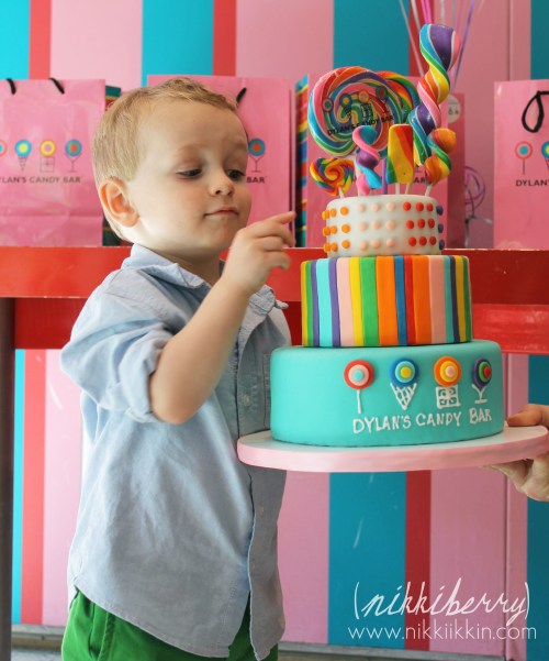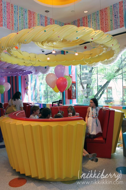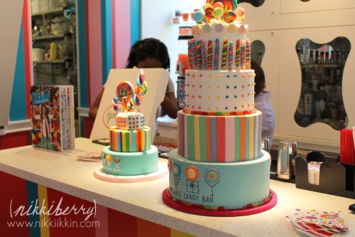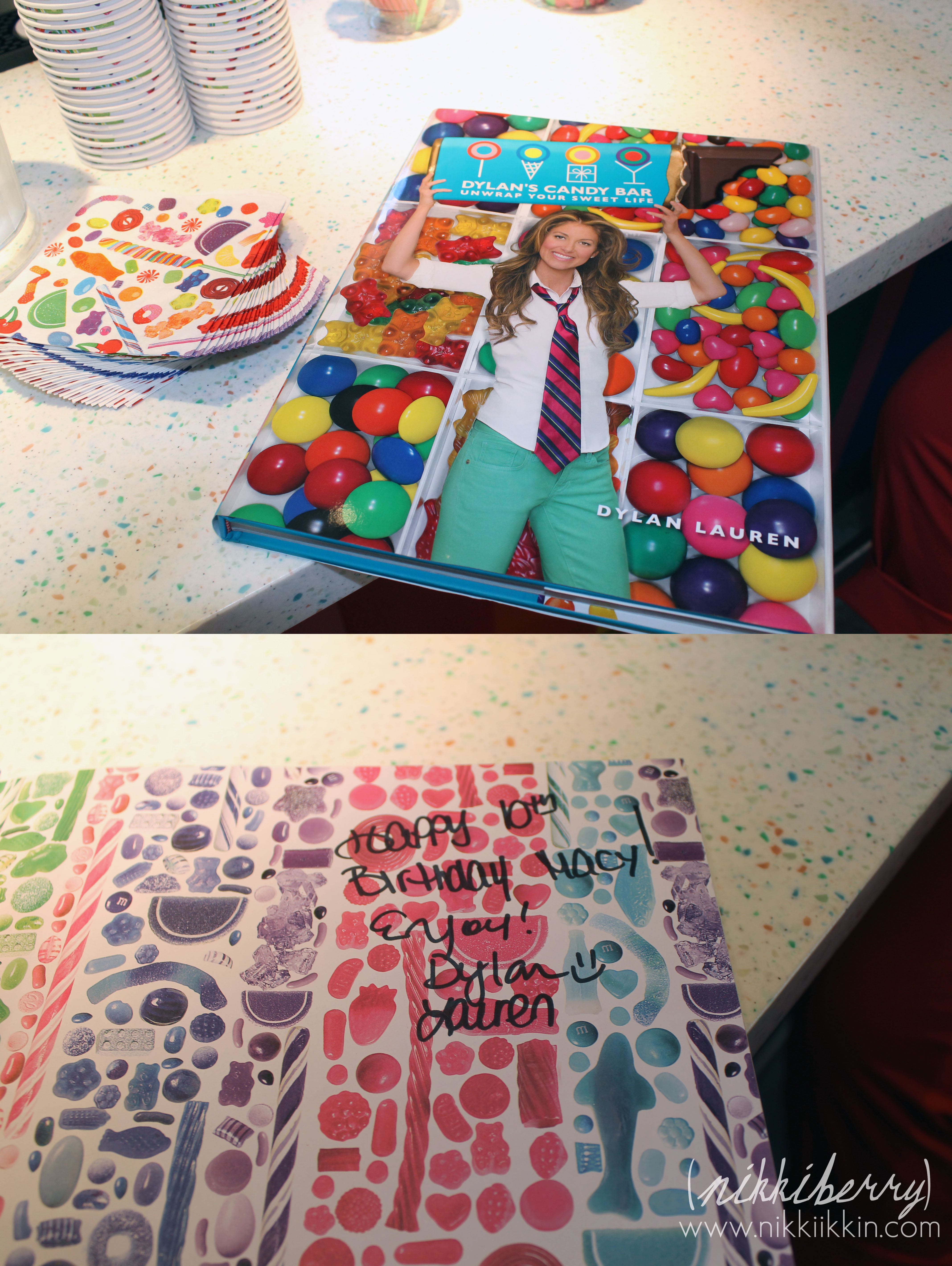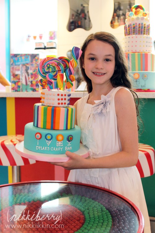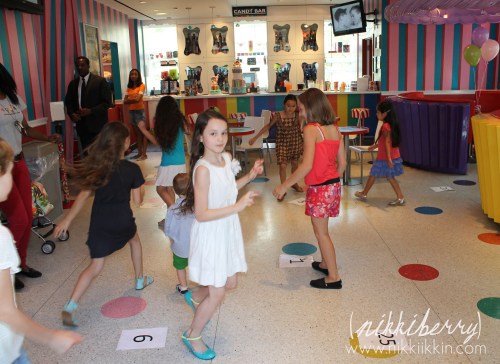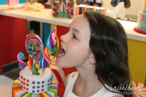 Dylan’s Candy Bar has a special events room that is located on the top floor just off of the cafe. When you book a general party there you choose between 3 types of parties packages that are all-inclusive. One type is just for 1,2&3 year olds, one type is for 21 & up and the third is for anyone 4 to 20 years old. Invitation, cake, pizza, drinks, favors, games, craft, decorations, guest of honor gift & lots and lots of sweets are all included in the party packages. And of course the sky is the limit on add-ons. The party coordinator was very easy to work with and even granted my out of the ordinary request of a signed copy of Dylan’s book and having one of their giant signature prop cakes in the room.