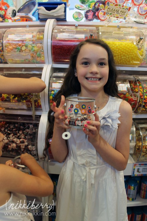 Although the girls were surrounded by candy on the tables they were probably most excited to do the candy spree. As their party favor each guest received a bucket to fill with whatever candy would fit from the hundreds of choices of confections on the main floor. To build up the excitement the party directors marched the girls through the store chanting “CANDY!, CANDY!, CANDY!” it was quite the experience!
